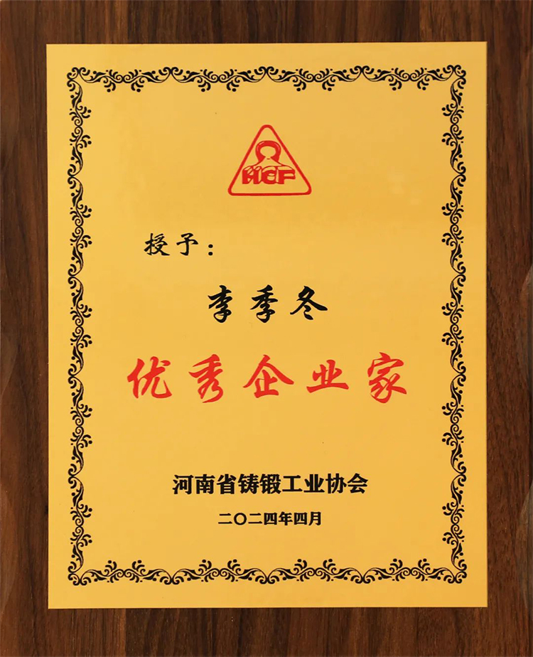 ? ? ?在2024年河南省铸锻工业年会上,公司被评为“河南省铸锻行业绿色铸造示范企业”荣誉称号,并被授予“铸锻行业优-秀企业”。李总被授予“优-秀企业家”称号。