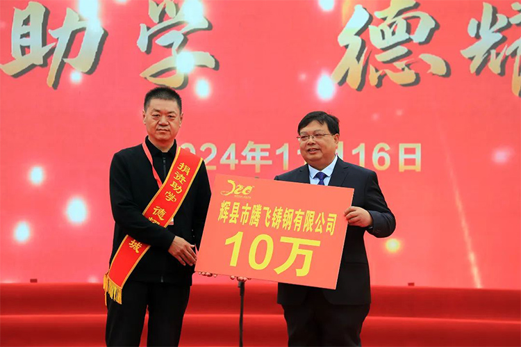 在这个意义非凡的日子里,我们公司的李总受邀出席了这场庆典。李总不仅作为嘉宾参与,更通过实际行动展现了对教育事业的支持与尊重——腾飞铸钢慷慨捐赠了十万元人民币,支持学校发展。