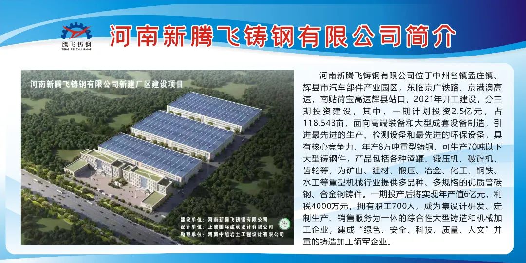 因铸件产品供不应求,为了更好服务客户,公司投资2.5亿元资金,新建“河南新腾飞铸钢有限公司”,占地面积120亩,打造年产8万吨高 端装备制造大型优 质铸钢件生产基地。